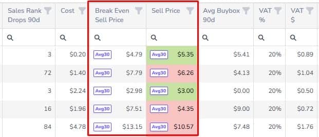 ? Break Even Sell Price is also included as a dedicated grid column. For convenience, the Sell Price column is highlighted green/red to indicate whether Sell Price is higher (green) or lower (red) than Break Even.